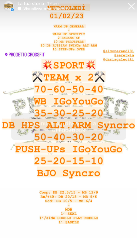 Pubblicato daprogettocrossfit1 febbraio 20239 febbraio 2023Pubblicato in: Wod Condividi: Fai clic per condividere su X (Si apre in una nuova finestra) X Fai clic per condividere su Facebook (Si apre in una nuova finestra) Facebook Mi piace Caricamento... Correlati