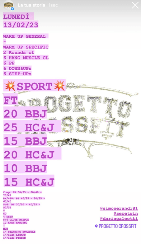 Pubblicato daprogettocrossfit13 febbraio 20234 marzo 2023Pubblicato in: Wod Condividi: Fai clic per condividere su X (Si apre in una nuova finestra) X Fai clic per condividere su Facebook (Si apre in una nuova finestra) Facebook Mi piace Caricamento... Correlati