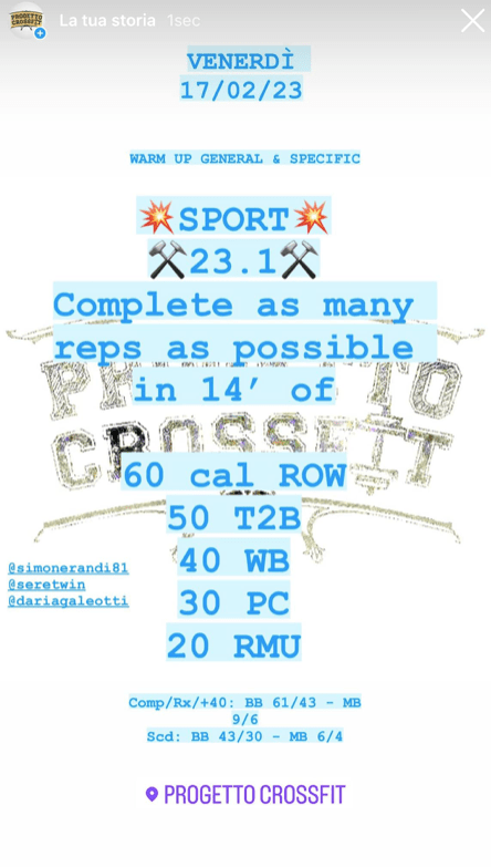Pubblicato daprogettocrossfit17 febbraio 20234 marzo 2023Pubblicato in: Wod Condividi: Fai clic per condividere su X (Si apre in una nuova finestra) X Fai clic per condividere su Facebook (Si apre in una nuova finestra) Facebook Mi piace Caricamento... Correlati