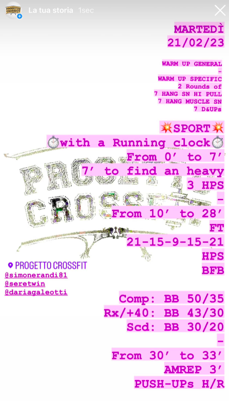 Pubblicato daprogettocrossfit21 febbraio 20234 marzo 2023Pubblicato in: Wod Condividi: Fai clic per condividere su X (Si apre in una nuova finestra) X Fai clic per condividere su Facebook (Si apre in una nuova finestra) Facebook Mi piace Caricamento... Correlati