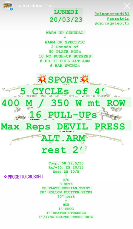 Pubblicato daprogettocrossfit20 marzo 202325 marzo 2023Pubblicato in: Wod Condividi: Fai clic per condividere su X (Si apre in una nuova finestra) X Fai clic per condividere su Facebook (Si apre in una nuova finestra) Facebook Mi piace Caricamento... Correlati