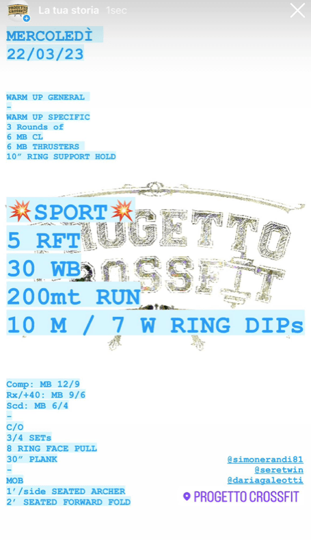 Pubblicato daprogettocrossfit22 marzo 202325 marzo 2023Pubblicato in: Wod Condividi: Fai clic per condividere su X (Si apre in una nuova finestra) X Fai clic per condividere su Facebook (Si apre in una nuova finestra) Facebook Mi piace Caricamento... Correlati