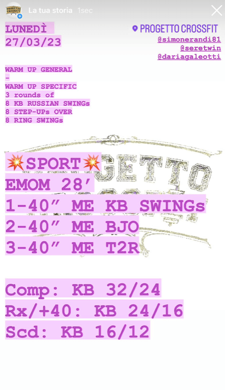 Pubblicato daprogettocrossfit27 marzo 20232 aprile 2023Pubblicato in: Wod Condividi: Fai clic per condividere su X (Si apre in una nuova finestra) X Fai clic per condividere su Facebook (Si apre in una nuova finestra) Facebook Mi piace Caricamento... Correlati