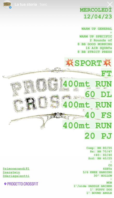 Pubblicato daprogettocrossfit12 aprile 202321 aprile 2023Pubblicato in: Wod Condividi: Fai clic per condividere su X (Si apre in una nuova finestra) X Fai clic per condividere su Facebook (Si apre in una nuova finestra) Facebook Mi piace Caricamento... Correlati