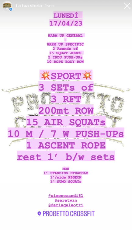Pubblicato daprogettocrossfit17 aprile 202321 aprile 2023Pubblicato in: Wod Condividi: Fai clic per condividere su X (Si apre in una nuova finestra) X Fai clic per condividere su Facebook (Si apre in una nuova finestra) Facebook Mi piace Caricamento... Correlati
