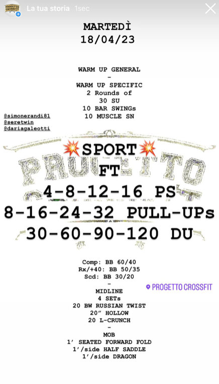 Pubblicato daprogettocrossfit18 aprile 202321 aprile 2023Pubblicato in: Wod Condividi: Fai clic per condividere su X (Si apre in una nuova finestra) X Fai clic per condividere su Facebook (Si apre in una nuova finestra) Facebook Mi piace Caricamento... Correlati