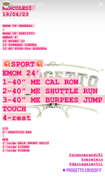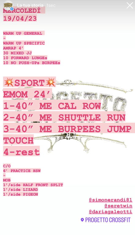 Pubblicato daprogettocrossfit19 aprile 202321 aprile 2023Pubblicato in: Wod Condividi: Fai clic per condividere su X (Si apre in una nuova finestra) X Fai clic per condividere su Facebook (Si apre in una nuova finestra) Facebook Mi piace Caricamento... Correlati