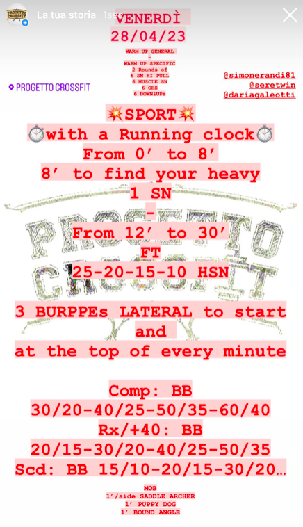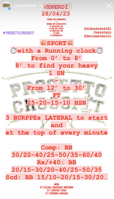 Pubblicato daprogettocrossfit28 aprile 20231 Maggio 2023Pubblicato in: Wod Condividi: Fai clic per condividere su X (Si apre in una nuova finestra) X Fai clic per condividere su Facebook (Si apre in una nuova finestra) Facebook Mi piace Caricamento... Correlati