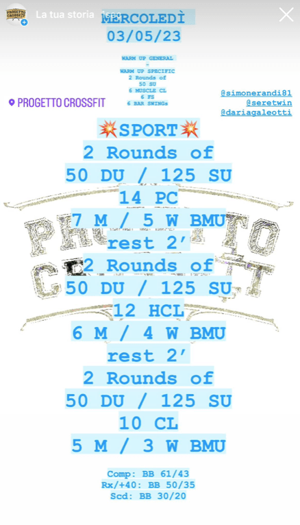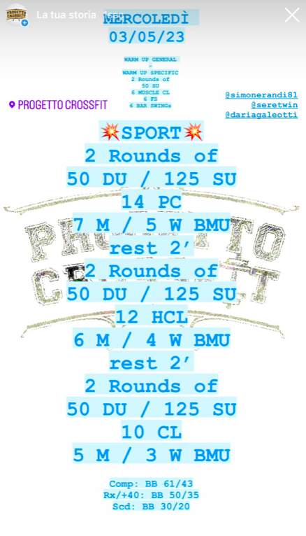 Pubblicato daprogettocrossfit3 Maggio 202314 Maggio 2023Pubblicato in: Wod Condividi: Fai clic per condividere su X (Si apre in una nuova finestra) X Fai clic per condividere su Facebook (Si apre in una nuova finestra) Facebook Mi piace Caricamento... Correlati