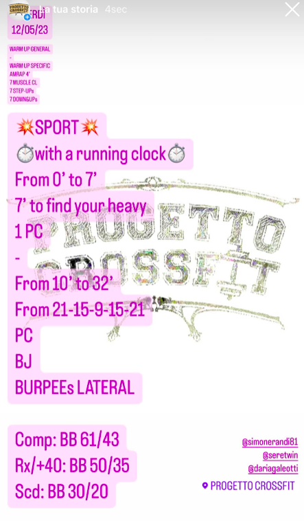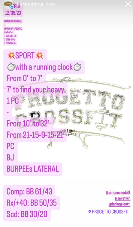 Pubblicato daprogettocrossfit12 Maggio 202314 Maggio 2023Pubblicato in: Wod Condividi: Fai clic per condividere su X (Si apre in una nuova finestra) X Fai clic per condividere su Facebook (Si apre in una nuova finestra) Facebook Mi piace Caricamento... Correlati