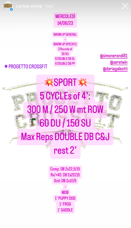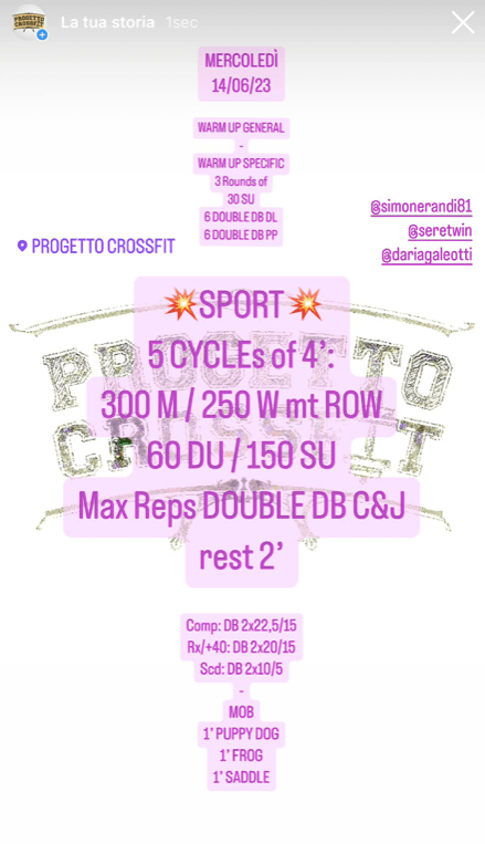 Pubblicato daprogettocrossfit14 giugno 202328 giugno 2023Pubblicato in: Wod Condividi: Fai clic per condividere su X (Si apre in una nuova finestra) X Fai clic per condividere su Facebook (Si apre in una nuova finestra) Facebook Mi piace Caricamento... Correlati