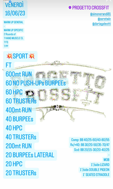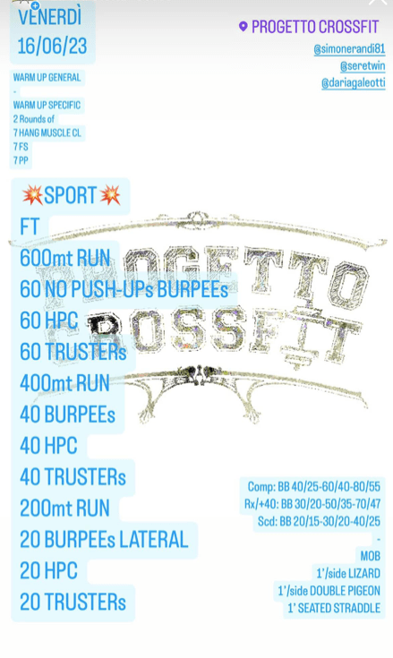 Pubblicato daprogettocrossfit16 giugno 202328 giugno 2023Pubblicato in: Wod Condividi: Fai clic per condividere su X (Si apre in una nuova finestra) X Fai clic per condividere su Facebook (Si apre in una nuova finestra) Facebook Mi piace Caricamento... Correlati