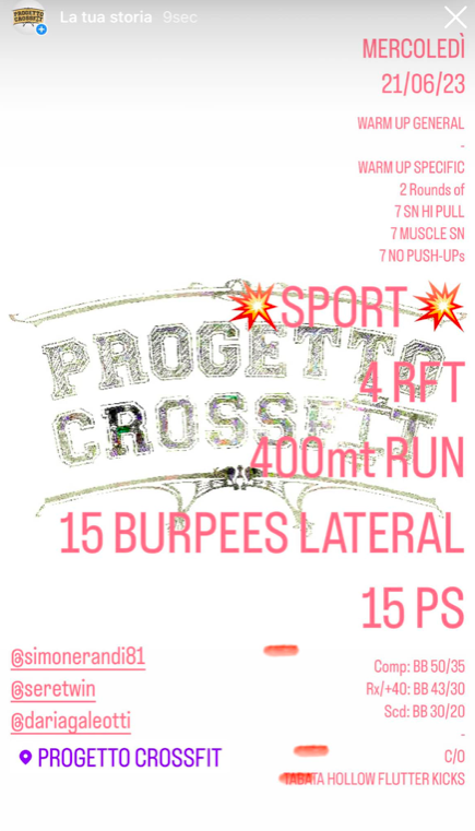 Pubblicato daprogettocrossfit21 giugno 202328 giugno 2023Pubblicato in: Wod Condividi: Fai clic per condividere su X (Si apre in una nuova finestra) X Fai clic per condividere su Facebook (Si apre in una nuova finestra) Facebook Mi piace Caricamento... Correlati