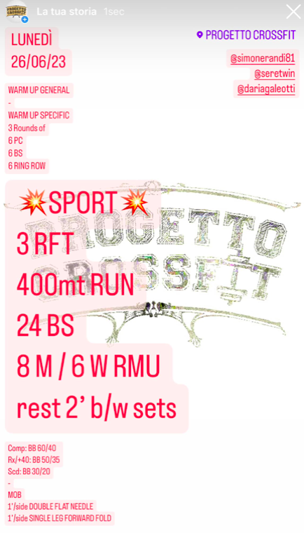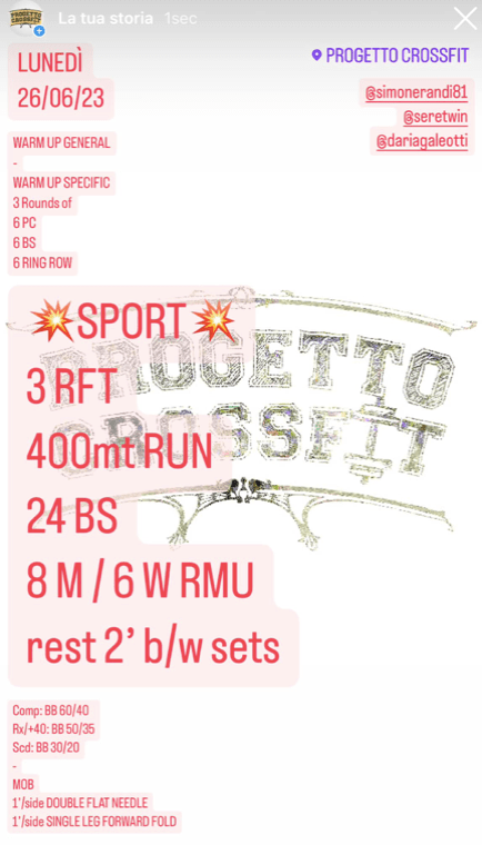 Wod 26/06/23 Pubblicato daprogettocrossfit26 giugno 202329 giugno 2023Pubblicato in: Wod Condividi: Fai clic per condividere su X (Si apre in una nuova finestra) X Fai clic per condividere su Facebook (Si apre in una nuova finestra) Facebook Mi piace Caricamento... Correlati