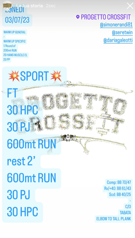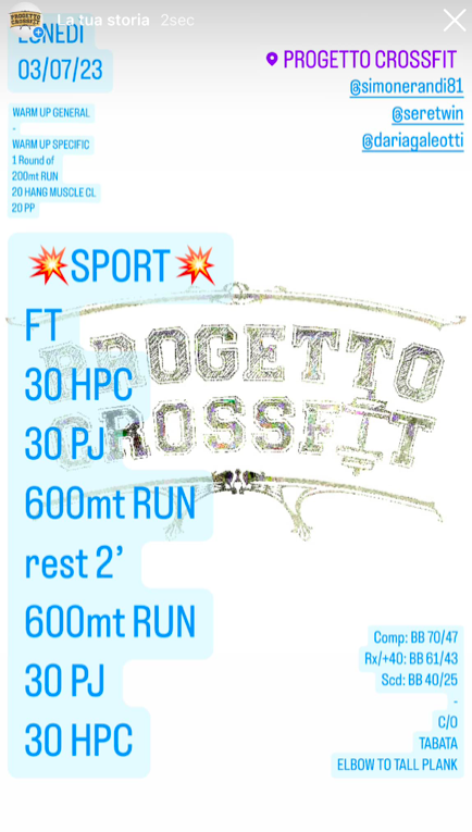 Wod 03/07/23 Pubblicato daprogettocrossfit3 luglio 202317 luglio 2023Pubblicato in: Wod Condividi: Fai clic per condividere su X (Si apre in una nuova finestra) X Fai clic per condividere su Facebook (Si apre in una nuova finestra) Facebook Mi piace Caricamento... Correlati