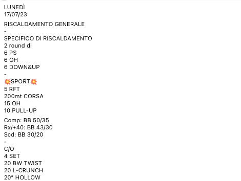 Pubblicato daprogettocrossfit17 luglio 202329 luglio 2023Pubblicato in: Wod Condividi: Fai clic per condividere su X (Si apre in una nuova finestra) X Fai clic per condividere su Facebook (Si apre in una nuova finestra) Facebook Mi piace Caricamento... Correlati