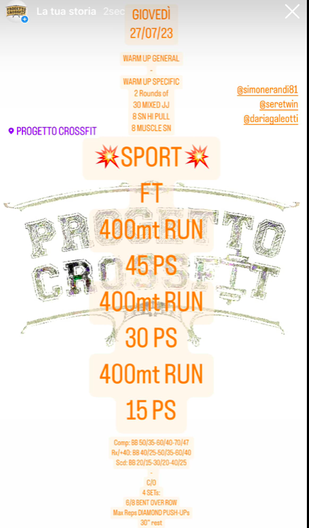 Pubblicato daprogettocrossfit27 luglio 202329 luglio 2023Pubblicato in: Wod Condividi: Fai clic per condividere su X (Si apre in una nuova finestra) X Fai clic per condividere su Facebook (Si apre in una nuova finestra) Facebook Mi piace Caricamento... Correlati