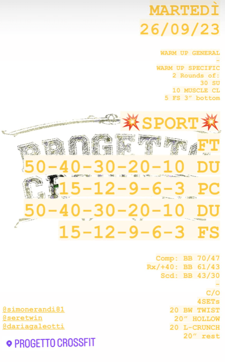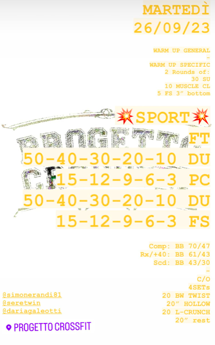 Pubblicato daprogettocrossfit26 settembre 20235 ottobre 2023Pubblicato in: Wod Condividi: Fai clic per condividere su X (Si apre in una nuova finestra) X Fai clic per condividere su Facebook (Si apre in una nuova finestra) Facebook Mi piace Caricamento... Correlati