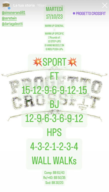 Pubblicato daprogettocrossfit17 ottobre 202319 ottobre 2023Pubblicato in: Wod Condividi: Fai clic per condividere su X (Si apre in una nuova finestra) X Fai clic per condividere su Facebook (Si apre in una nuova finestra) Facebook Mi piace Caricamento... Correlati
