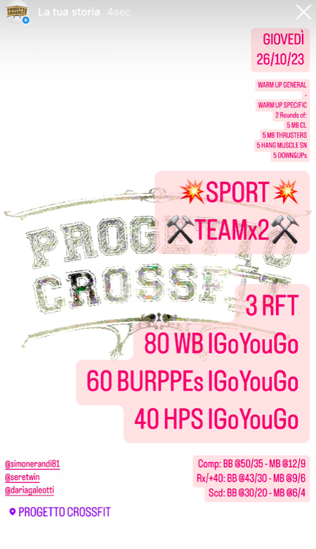 Pubblicato daprogettocrossfit26 ottobre 202315 novembre 2023Pubblicato in: Wod Condividi: Fai clic per condividere su X (Si apre in una nuova finestra) X Fai clic per condividere su Facebook (Si apre in una nuova finestra) Facebook Mi piace Caricamento... Correlati