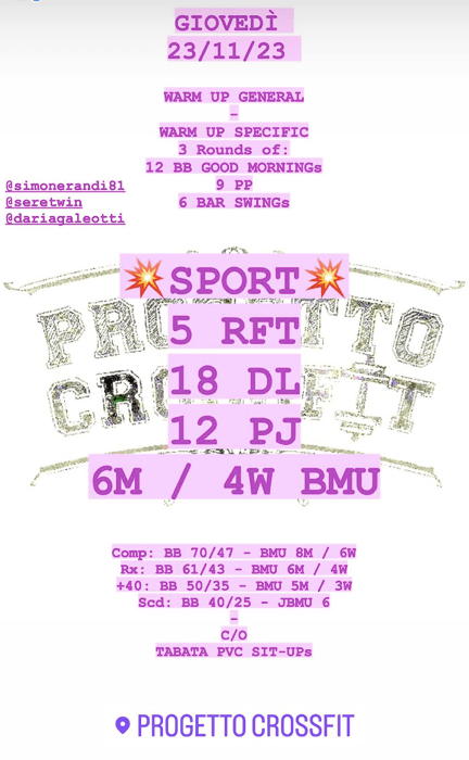 Pubblicato daprogettocrossfit23 novembre 202328 novembre 2023Pubblicato in: Wod Condividi: Fai clic per condividere su X (Si apre in una nuova finestra) X Fai clic per condividere su Facebook (Si apre in una nuova finestra) Facebook Mi piace Caricamento... Correlati