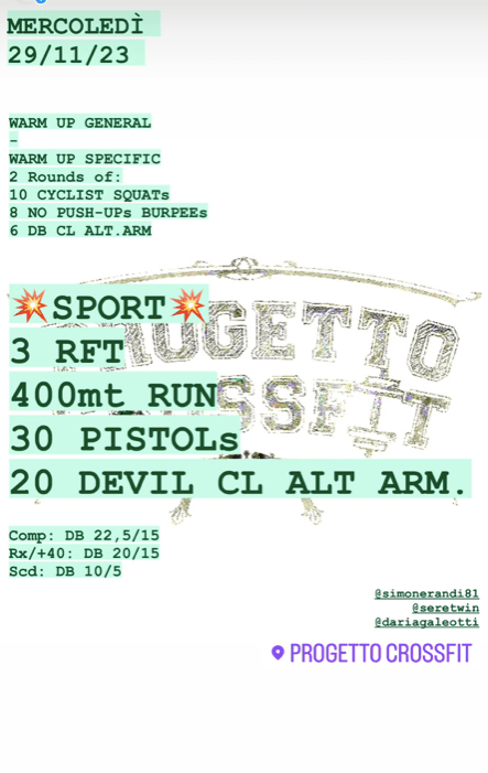 Pubblicato daprogettocrossfit29 novembre 202324 dicembre 2023Pubblicato in: Wod Condividi: Fai clic per condividere su X (Si apre in una nuova finestra) X Fai clic per condividere su Facebook (Si apre in una nuova finestra) Facebook Mi piace Caricamento... Correlati
