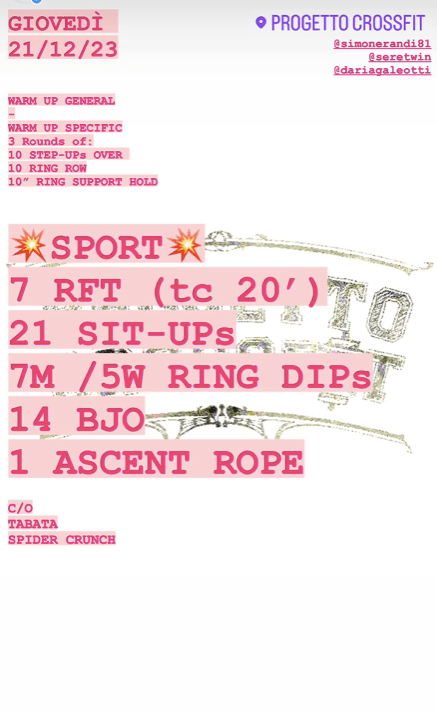 Pubblicato daprogettocrossfit21 dicembre 202325 dicembre 2023Pubblicato in: Wod Condividi: Fai clic per condividere su X (Si apre in una nuova finestra) X Fai clic per condividere su Facebook (Si apre in una nuova finestra) Facebook Mi piace Caricamento... Correlati