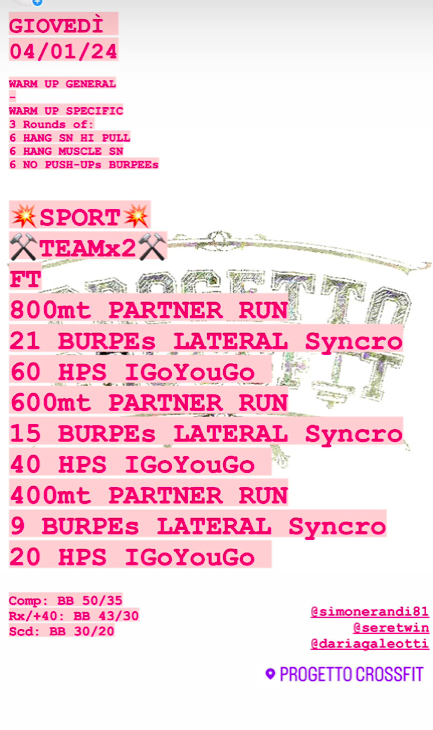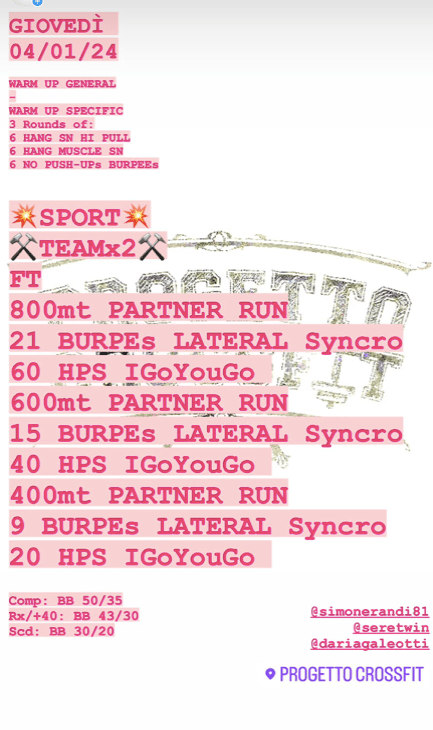 Pubblicato daprogettocrossfit4 gennaio 202414 gennaio 2024Pubblicato in: Wod Condividi: Fai clic per condividere su X (Si apre in una nuova finestra) X Fai clic per condividere su Facebook (Si apre in una nuova finestra) Facebook Mi piace Caricamento... Correlati