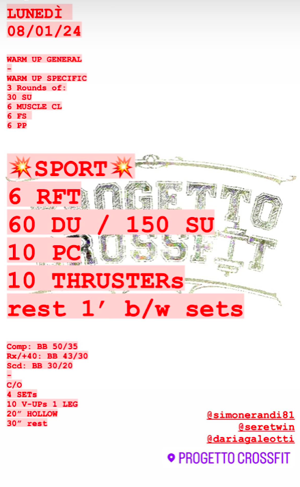 Pubblicato daprogettocrossfit8 gennaio 202414 gennaio 2024Pubblicato in: Wod Condividi: Fai clic per condividere su X (Si apre in una nuova finestra) X Fai clic per condividere su Facebook (Si apre in una nuova finestra) Facebook Mi piace Caricamento... Correlati