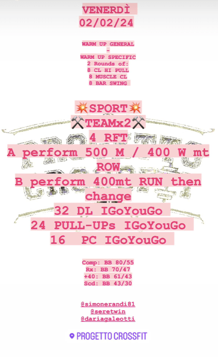 Pubblicato daprogettocrossfit2 febbraio 202411 febbraio 2024Pubblicato in: Wod Condividi: Fai clic per condividere su X (Si apre in una nuova finestra) X Fai clic per condividere su Facebook (Si apre in una nuova finestra) Facebook Mi piace Caricamento... Correlati