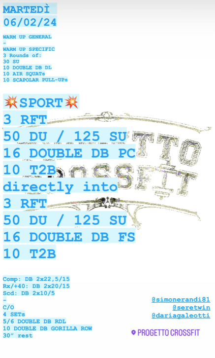 Pubblicato daprogettocrossfit6 febbraio 202411 febbraio 2024Pubblicato in: Wod Condividi: Fai clic per condividere su X (Si apre in una nuova finestra) X Fai clic per condividere su Facebook (Si apre in una nuova finestra) Facebook Mi piace Caricamento... Correlati