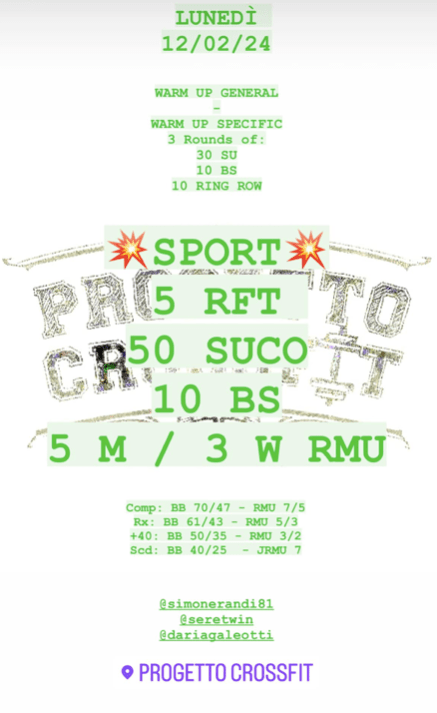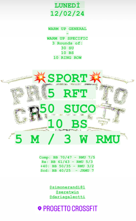 Pubblicato daprogettocrossfit12 febbraio 20244 marzo 2024Pubblicato in: Wod Condividi: Fai clic per condividere su X (Si apre in una nuova finestra) X Fai clic per condividere su Facebook (Si apre in una nuova finestra) Facebook Mi piace Caricamento... Correlati