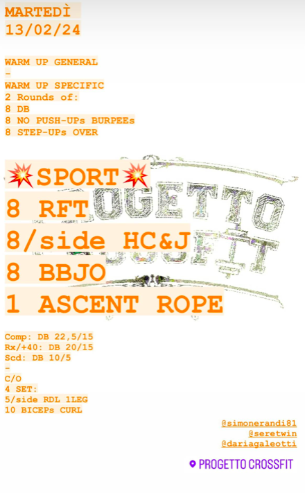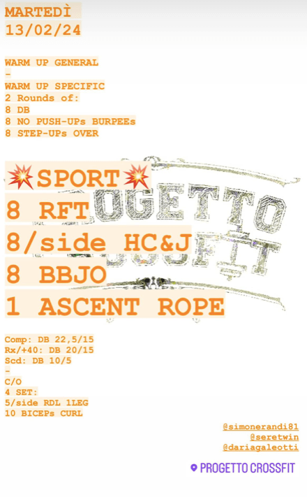 Pubblicato daprogettocrossfit13 febbraio 20244 marzo 2024Pubblicato in: Wod Condividi: Fai clic per condividere su X (Si apre in una nuova finestra) X Fai clic per condividere su Facebook (Si apre in una nuova finestra) Facebook Mi piace Caricamento... Correlati
