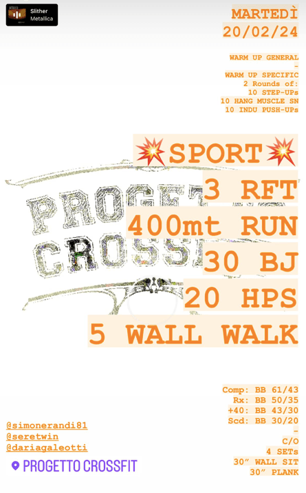 Pubblicato daprogettocrossfit20 febbraio 20244 marzo 2024Pubblicato in: Wod Condividi: Fai clic per condividere su X (Si apre in una nuova finestra) X Fai clic per condividere su Facebook (Si apre in una nuova finestra) Facebook Mi piace Caricamento... Correlati