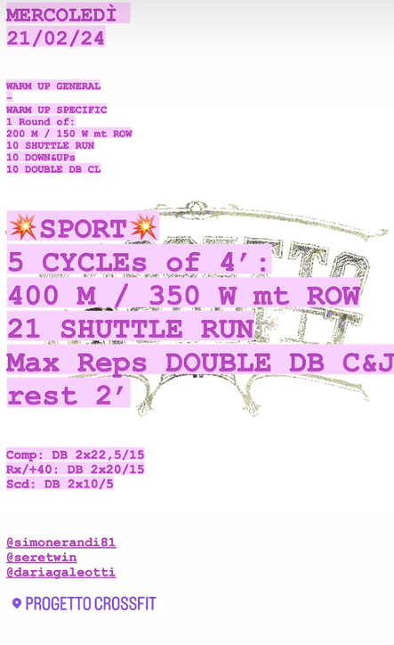 Pubblicato daprogettocrossfit21 febbraio 20244 marzo 2024Pubblicato in: Wod Condividi: Fai clic per condividere su X (Si apre in una nuova finestra) X Fai clic per condividere su Facebook (Si apre in una nuova finestra) Facebook Mi piace Caricamento... Correlati