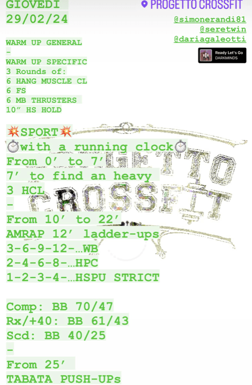 Pubblicato daprogettocrossfit29 febbraio 20244 marzo 2024Pubblicato in: Wod Condividi: Fai clic per condividere su X (Si apre in una nuova finestra) X Fai clic per condividere su Facebook (Si apre in una nuova finestra) Facebook Mi piace Caricamento... Correlati