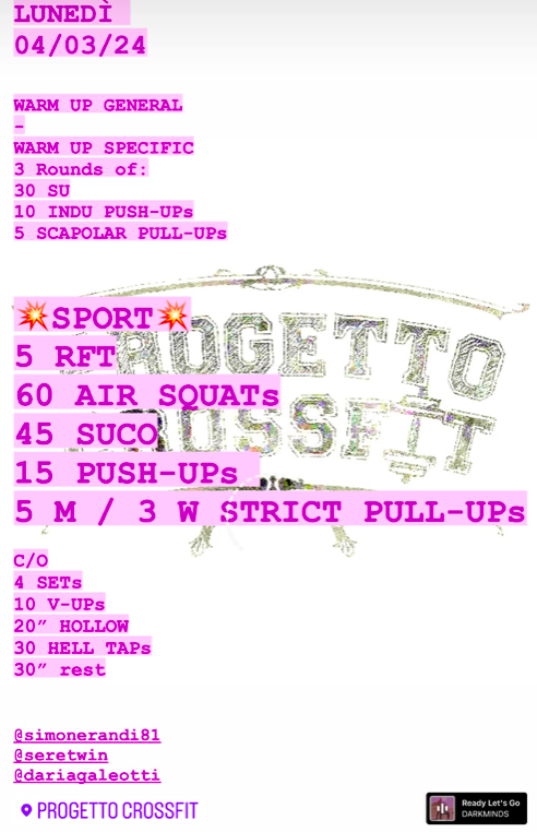 Pubblicato daprogettocrossfit4 marzo 2024Pubblicato in: Wod Condividi: Fai clic per condividere su X (Si apre in una nuova finestra) X Fai clic per condividere su Facebook (Si apre in una nuova finestra) Facebook Mi piace Caricamento... Correlati