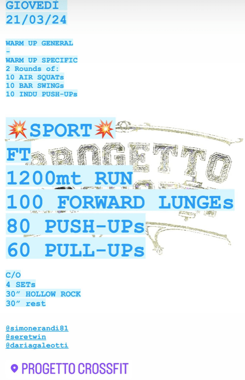 Pubblicato daprogettocrossfit21 marzo 20241 aprile 2024Pubblicato in: Wod Condividi: Fai clic per condividere su X (Si apre in una nuova finestra) X Fai clic per condividere su Facebook (Si apre in una nuova finestra) Facebook Mi piace Caricamento... Correlati