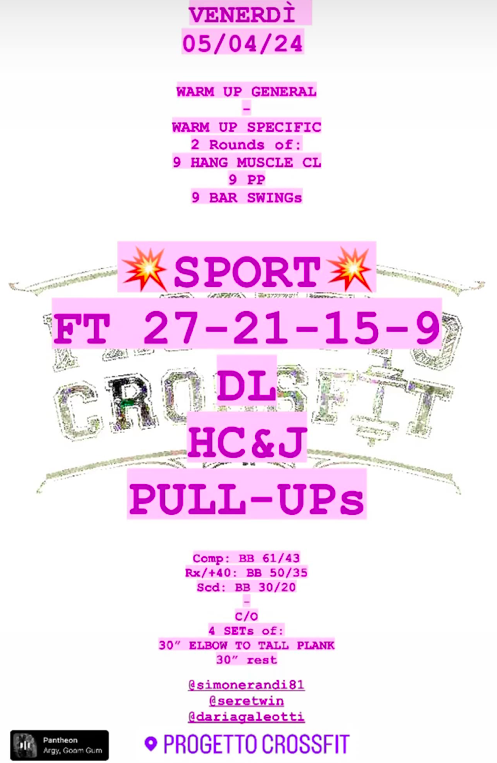 Pubblicato daprogettocrossfit5 aprile 20245 Maggio 2024Pubblicato in: Wod Condividi: Fai clic per condividere su X (Si apre in una nuova finestra) X Fai clic per condividere su Facebook (Si apre in una nuova finestra) Facebook Mi piace Caricamento... Correlati