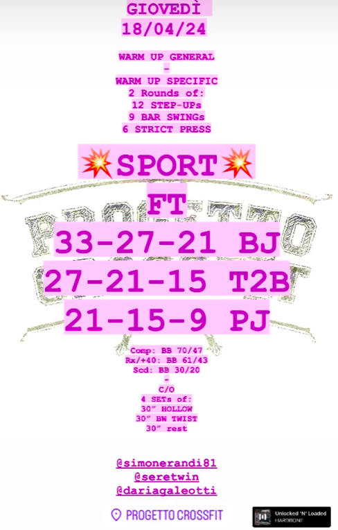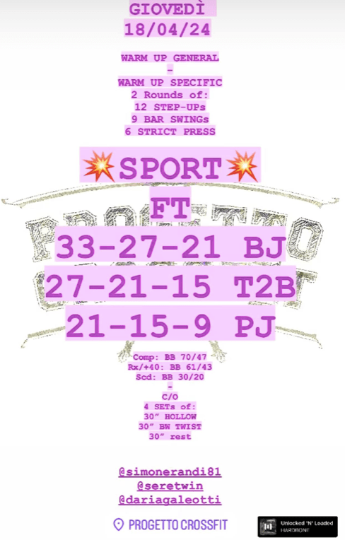 Pubblicato daprogettocrossfit18 aprile 20245 Maggio 2024Pubblicato in: Wod Condividi: Fai clic per condividere su X (Si apre in una nuova finestra) X Fai clic per condividere su Facebook (Si apre in una nuova finestra) Facebook Mi piace Caricamento... Correlati