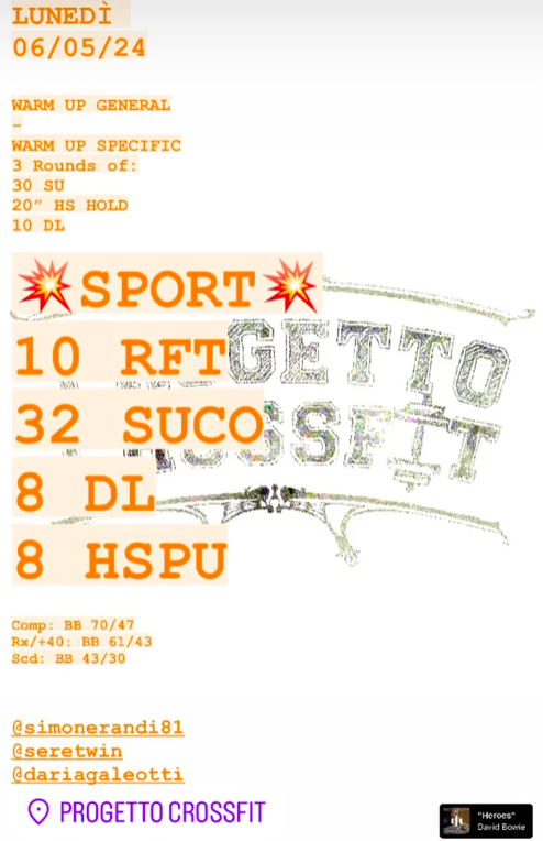 Pubblicato daprogettocrossfit6 Maggio 202426 Maggio 2024Pubblicato in: Wod Condividi: Fai clic per condividere su X (Si apre in una nuova finestra) X Fai clic per condividere su Facebook (Si apre in una nuova finestra) Facebook Mi piace Caricamento... Correlati