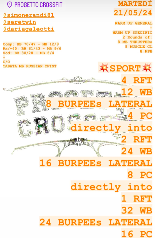 Pubblicato daprogettocrossfit21 Maggio 202426 Maggio 2024Pubblicato in: Wod Condividi: Fai clic per condividere su X (Si apre in una nuova finestra) X Fai clic per condividere su Facebook (Si apre in una nuova finestra) Facebook Mi piace Caricamento... Correlati