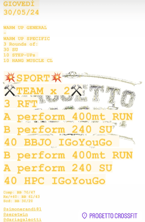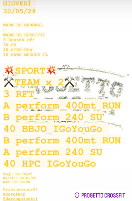 Pubblicato daprogettocrossfit30 Maggio 20243 luglio 2024Pubblicato in: Wod Condividi: Fai clic per condividere su X (Si apre in una nuova finestra) X Fai clic per condividere su Facebook (Si apre in una nuova finestra) Facebook Mi piace Caricamento... Correlati