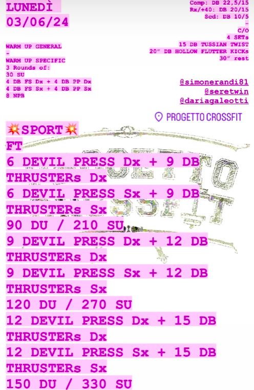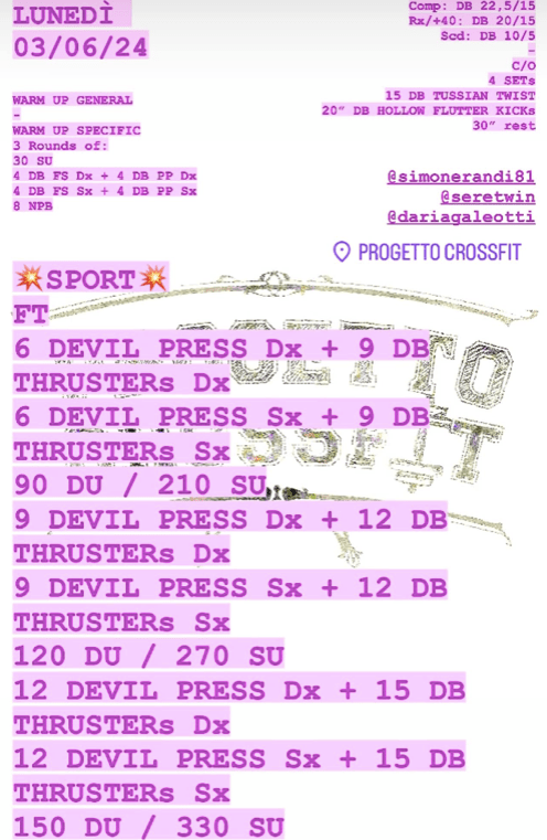 Pubblicato daprogettocrossfit3 giugno 20243 luglio 2024Pubblicato in: Wod Condividi: Fai clic per condividere su X (Si apre in una nuova finestra) X Fai clic per condividere su Facebook (Si apre in una nuova finestra) Facebook Mi piace Caricamento... Correlati