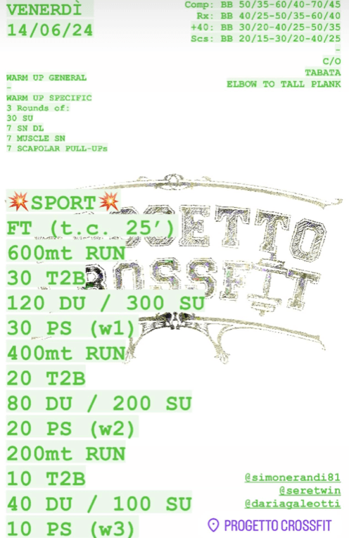 Pubblicato daprogettocrossfit14 giugno 20243 luglio 2024Pubblicato in: Wod Condividi: Fai clic per condividere su X (Si apre in una nuova finestra) X Fai clic per condividere su Facebook (Si apre in una nuova finestra) Facebook Mi piace Caricamento... Correlati