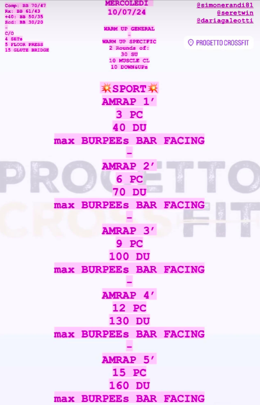 Pubblicato daprogettocrossfit10 luglio 202431 luglio 2024Pubblicato in: Wod Condividi: Fai clic per condividere su X (Si apre in una nuova finestra) X Fai clic per condividere su Facebook (Si apre in una nuova finestra) Facebook Mi piace Caricamento... Correlati