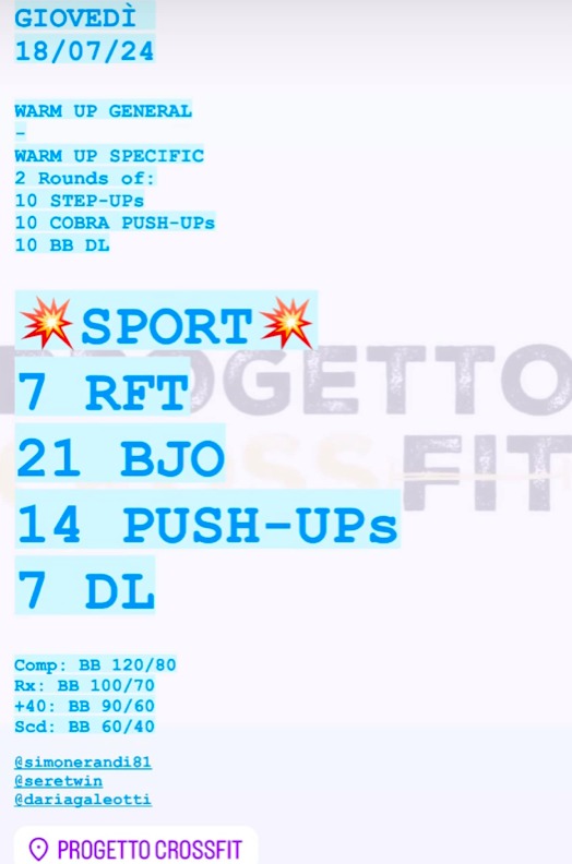 Pubblicato daprogettocrossfit18 luglio 202431 luglio 2024Pubblicato in: Wod Condividi: Fai clic per condividere su X (Si apre in una nuova finestra) X Fai clic per condividere su Facebook (Si apre in una nuova finestra) Facebook Mi piace Caricamento... Correlati