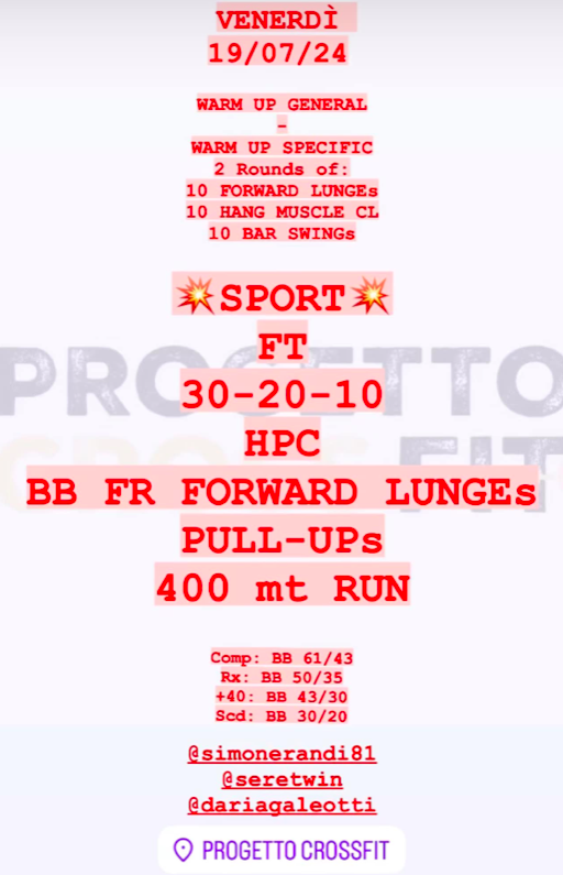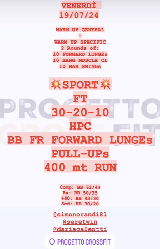 Pubblicato daprogettocrossfit19 luglio 202431 luglio 2024Pubblicato in: Wod Condividi: Fai clic per condividere su X (Si apre in una nuova finestra) X Fai clic per condividere su Facebook (Si apre in una nuova finestra) Facebook Mi piace Caricamento... Correlati