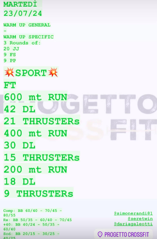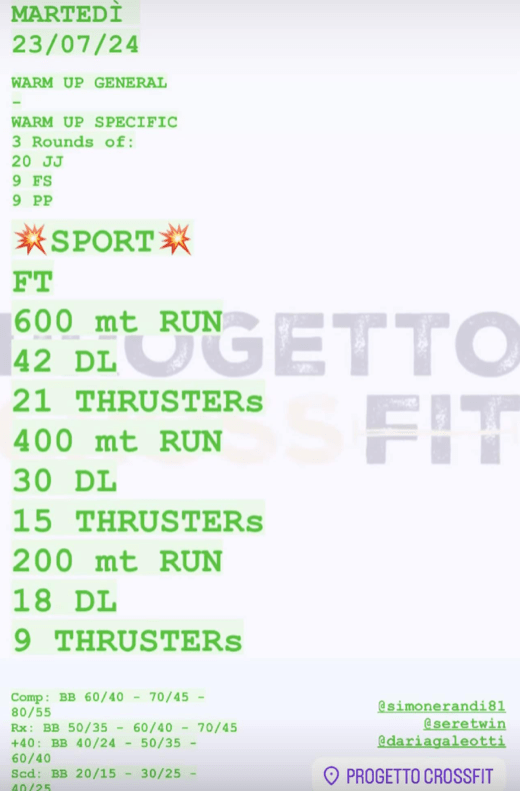 Pubblicato daprogettocrossfit23 luglio 202431 luglio 2024Pubblicato in: Wod Condividi: Fai clic per condividere su X (Si apre in una nuova finestra) X Fai clic per condividere su Facebook (Si apre in una nuova finestra) Facebook Mi piace Caricamento... Correlati