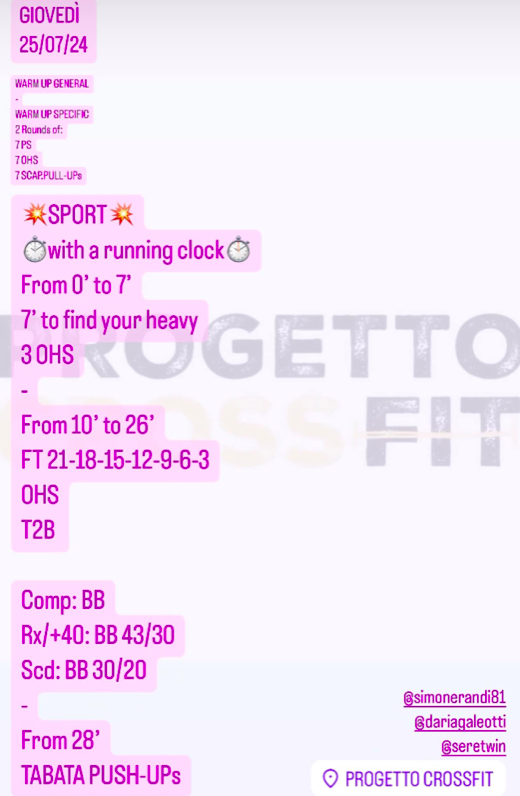 Pubblicato daprogettocrossfit25 luglio 202431 luglio 2024Pubblicato in: Wod Condividi: Fai clic per condividere su X (Si apre in una nuova finestra) X Fai clic per condividere su Facebook (Si apre in una nuova finestra) Facebook Mi piace Caricamento... Correlati